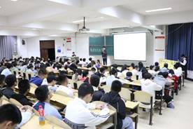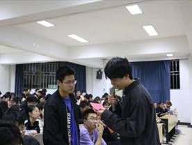接着18级优秀学生代表周靖淞就科技创新和企业实习方面谈了他的心得体会,他向同学们分享了一些在大学期间大学生值得参加的竞赛,结尾他分享了一段中科院博士论文的片段:“你在三四月做的事,在八九月自有答案。”来激励同学们要脚踏实地,辛勤耕耘。