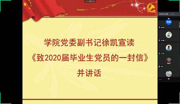党委副书记徐凯宣读《致2020届毕业生党员的一封信》并讲话。他对同学们提出了两点殷切希望,一是要牢固树立“不忘初心,努力奋进”的信念。二是希望同学们立场坚如磐石,时刻与党中央保持高度一致。
