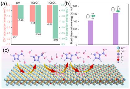 糠醛是农林废弃物水解过程中的典型产物,广泛存在于生物质精炼、造纸等行业废水中,对微生物和水生生物具有明显毒性,传统生化处理方法效率低、周期长。针对这一环境难题,研究团队通过精准调控催化剂表面的氧空位,构建了具有路易斯酸特性的活性位点,有效增强了电极界面对氢氧根离子的富集能力,成功缓解了反应过程中的局部酸化问题。实验结果表明,该催化剂在电催化糠醛氧化反应中表现出优异性能,糠酸法拉第效率超过93%,并能够稳定运行150小时以上。理论计算进一步揭示,氧空位与钴活性位点之间形成了协同催化机制,实现了污染物高效转化与高选择性的统一。该研究为有毒有机污染物的绿色电催化资源化提供了新思路。