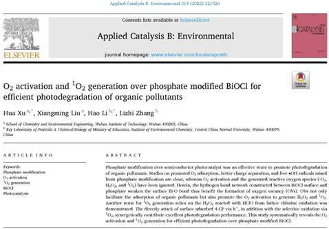 许华老师的研究论文“O2activation and1O2generation over phosphate modifiedBiOCl for efficient photodegradation of organic pollutants (Applied Catalysis B: Environmental 314(2022)121520)”(第一作者:许华,第二作者:硕士刘香铭)。