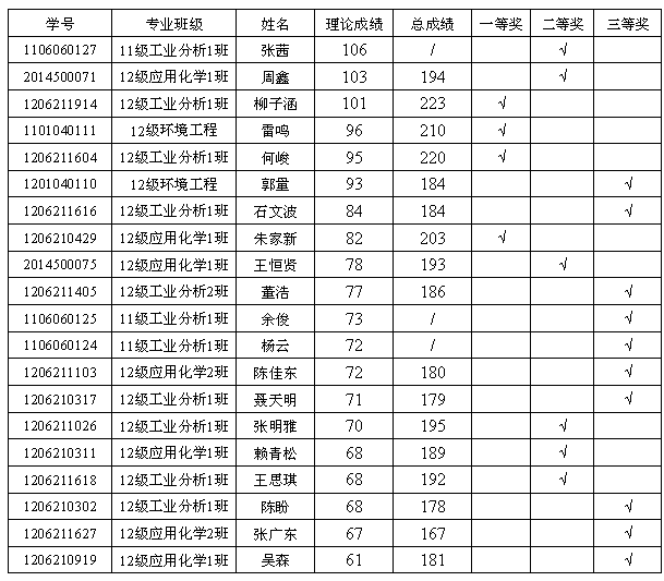 共有45名学生自由报名参加了本次实验竞赛。竞赛由实验基本理论和基础知识笔试与化学实验技能现场操作两个部分组成,经各实验课程主讲教师和实验员评卷和现场评分,根据总成绩排名,以下20名同学分别获得本次竞赛的一、二、三等奖: