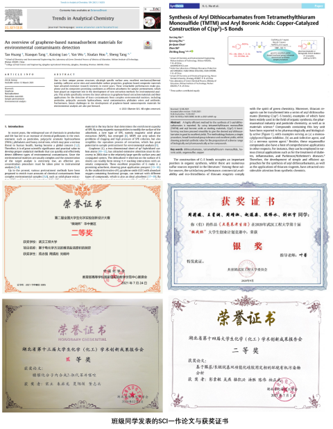 高度重视“互联网+”全国大学生创新创业竞赛、全国大学生化学实验技能竞赛,全国大学生化学实验创新设计大赛等学科竞赛。班级同学积极参与,取得了喜人的成绩。其中,黄涛同学以第一作者在国际学术期刊上发表SCI收录论文1篇,夏旭领、朱启龙同学以共同第一作者在国际学术期刊上发表SCI收录论文1篇,苑志强、白亦可均以第四作者发表SCI论文共2篇,董双凤以第三作者发表中文论文1篇。苑志强、周靖淞、刘晓玲同学组队参加第二届“微瑞杯”全国大学生化学实验创新实验设计竞赛并荣获华中赛区二等奖1项。全班多名同学参加湖北省第十三届、第十四届大学生化学(化工)学术创新成果报告会,并荣获一等奖1项,二等奖2项,三等奖2项。周靖淞同学在多次参加创新大赛,并荣获2020年“互联网+”金奖1项、铜奖2项,荣获2021年“互联网+”银奖1项,2021年“挑战杯”红色专项活动二等奖1项,2020年“挑战杯”获银奖1项。董双凤同学荣获武汉工程大学第六届大学生化工大赛一等奖。另外,黄涛还参加第12届全国大学生数学竞赛并荣获三等奖1项。