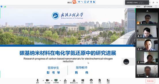 指导下,做足了功课,曾多次召开了集中在线答辩培训会议,规范了集中在线答辩的要求,提前完成了预定会议、确定答辩分组及顺序、收集毕业论文等一些列准备工作。答辩前,要求各答辩小组都提前组织了模拟答辩,以保证每位答辩委员和学生都能熟练使用腾讯会议平台。答辩时,答辩学生采用屏幕共享PPT的方式进行5分钟左右的陈述,从研究背景、研究内容、结果与讨论、结论与展望等方面逐一汇报毕业论文相关工作。答辩现场学术氛围浓厚,学生认真地陈述、回答问题,答辩专家有针对性地逐一点评和提问,并对毕业论文中存在的问题提出修改意见或建议,学生与专家之间突破了空间限制束缚,实现了“零距离”指导和交流。此次“云答辩”严格遵守了学校关于毕业论文答辩的相关规定,通过老师们和同学们的相互配合,整体情况平稳有序,答辩过程流畅,各答辩小组高效、高质量地完成了在线答辩工作,所有参加答辩的学生都顺利通过了答辩。答辩结束后,答辩委员会针对此次疫情下特殊的毕业论文完成情况,对即将走上工作岗位的毕业生提出了谆谆告诫和殷切希望,希望全体应化专业的毕业生要恪守学术道德与学术规范,秉承刻苦钻研和精益求精的精神,满怀时不待我和甘于奉献的社会责任感,投身到未来的学习与工作中去。