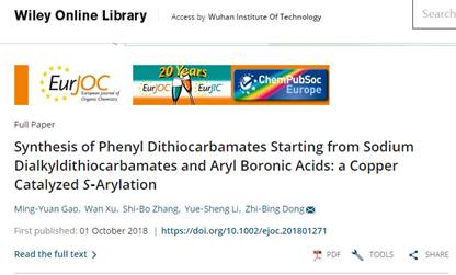 2015级本科生张士博、高明源同学相继在国际高水平期刊以第一单位、第一作者身份发表SCI研究论文,其研究成果先后在国际著名有机化学期刊TheJournal of Organic Chemistry (2018,DOI:10.1021/acs.joc.8b02136,JCR一区,第一作者:张士博,通讯作者:董志兵)、EuropeanJournal of Organic Chemistry (2018,DOI: 10.1002/ejoc.201801271,JCR二区,第一作者:高明源,通讯作者:董志兵)发表。