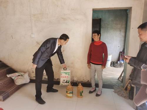 分别到对口帮扶脱贫户家中了解生活困难情况,并送去了食用大米、油等生活物资。