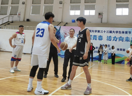 李志旭为学生、教工篮球友谊赛开球。赛场上,双方球员奋力驰骋,抢球、传球、投篮,队友间紧密配合,记分板上的数字不断变化,双方球员们愈战愈勇,上演了一场精彩绝伦的交锋。赛后,双方参赛选手进行了合影留念。