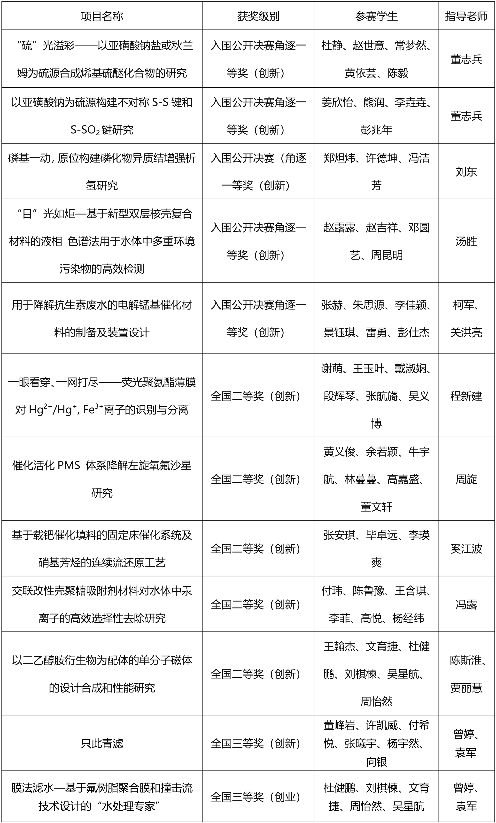 师生共获得12项国家级奖项,其中入围公开决赛有望争夺国家级一等奖有5项,获得国家级二等奖5项、三等奖2项,获奖学生主要集中在2020级和2021级应用化学和环境工程专业,获奖数量和质量再创新高(515足球直播