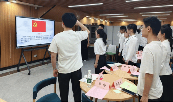 研究生第一党支部赵元勋同志领誓,全体党员举起右手面向党旗,庄严地重温了入党誓词,誓言铿锵,激荡着坚定的信仰,汇聚起前行的力量。严敏和邓欢等与会领导向研究生第一党支部第二季度入党的同志们赠送了政治生日贺卡,用生动的载体、鲜活的形式进一步增强了党员意识。