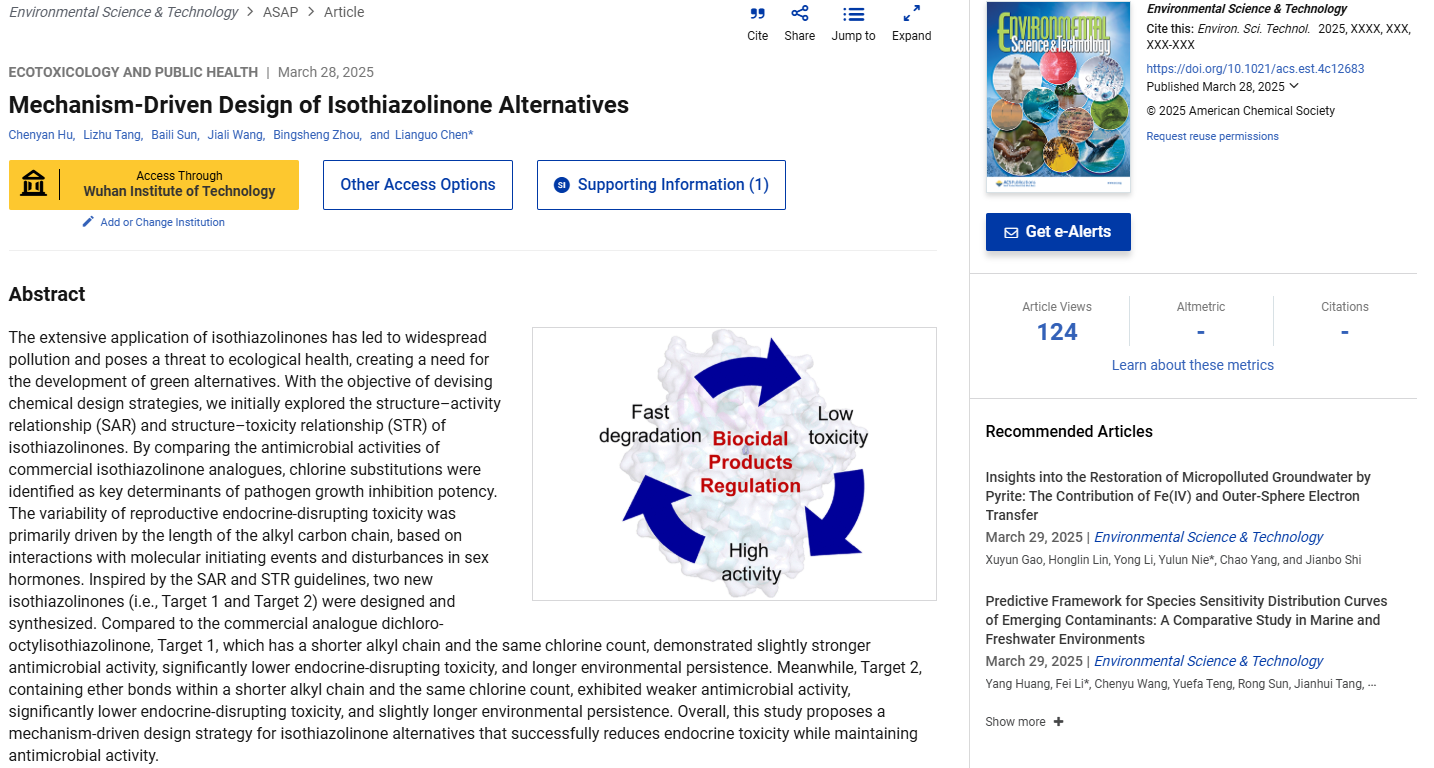 515足球直播 教师胡陈艳在Environmental Science & Technology期刊上发表论文 作者:发布时间:2025-04-17点击率: (通讯员 胡陈艳)2025年3月28日环境科学与工程领域顶级期刊Environmental Science & Technology(ES&T)在线发表515足球直播 胡陈艳老师为第一作者(515足球直播 为第一单位)的研究论文“Mechanism-Driven Design of Isothiazolinone Alternatives”。异噻唑啉酮是一类高效广谱抗菌剂,广泛应用于护理产品、家庭用品和建筑船舶涂层。然而,其生产使用已造成广泛环境污染,干扰生殖内分泌功能,严重威胁生态健康,成为亟需关注和治理的新污染物。因此,开发高效低毒的绿色替代品迫在眉睫。本研究选取6种代表性异噻唑啉酮类似物,系统评估和比较其抗菌活性、胚胎急性毒性、Gαi靶蛋白亲和能力、以及内分泌干扰毒性,明确了决定抗菌活性与内分泌干扰毒性的关键结构元件。基于结构-活性关系(SAR)与结构-毒性关系(STR),采用机制驱动的设计策略,提出异噻唑啉酮替代品的合成路线:(1)保留氯取代和异噻唑啉酮环以保持有效的抗菌活性;(2)去除芳香环以避免引入内分泌干扰毒性;(3)缩短烷基碳链或引入醚键以降低疏水性和内分泌干扰毒性,成功合成两种新型异噻唑啉酮替代品(Target 1、Target 2),并对其抗菌活性、内分泌干扰毒性及环境降解动力学进行了全面评估。与具有C8烷基链和两个氯原子的商业化DCOIT相比,Target 1(C4烷基链、两个氯原子)展现出略高的抗菌活性、显著更低的雌激素毒性、以及更慢的降解速率;而Target 2(含有醚键的较短烷基链、两个氯原子)则表现出较弱的抗菌活性、显著更低的雌激素毒性,并且降解速度略慢。考虑到在保持抗菌性能的同时降低生态风险的综合需求,Target 1和Target 2均展现出作为各类产品中新型防腐剂的应用潜力。综上所述,本研究基于异噻唑啉酮的SAR和STR,采用机制驱动的设计策略,成功获得两种生态友好的新型异噻唑啉酮替代品,这一成果不仅可有效满足工业生产需求,还为未来绿色低毒化学品的设计提供了新的思路。ES&T杂志是美国化学学会的旗舰期刊,为中科院环境大类一区和JCR一区期刊,当前影响因子为10.9。这一研究主要由胡陈艳老师与中国科515足球直播 水生生物研究所陈联国研究员(论文通讯作者)合作完成,链接为://pubs.acs.org/doi/10.1021/acs.est.4c12683。 (审稿 张华丽)