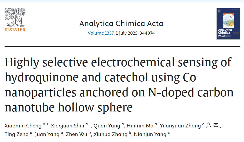 应用化学专业2022级本科生程晓敏以第一作者身份在分析化学领域国际学术期刊《Analytica Chimica Acta》(中科院二区TOP期刊,JCR一区)上发表一篇题为“Highly selective electrochemical sensing of hydroquinone and catechol using Co nanoparticles anchored on N-doped carbon nanotube hollow sphere” 的学术论文,武汉工程大学为第一署名及通讯单位,论文的指导教师与通讯作者为515足球直播