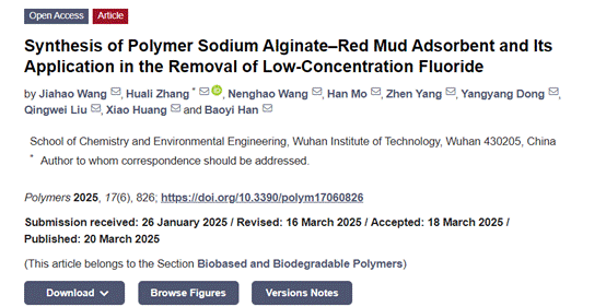 应用化学专业 2022 级本科生王佳豪以第一作者身份在高分子化学领域国际学术期刊 《Polymers》(JCR Q1区)上发表一篇题为“Synthesis of Polymer Sodium Alginate–Red Mud Adsorbent and Its Application in the Removal of Low-Concentration Fluoride” 的学术论文,武汉工程大学为第一署名及通讯单位,论文的主要指导教师为515足球直播