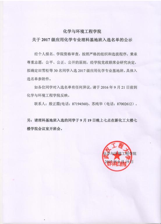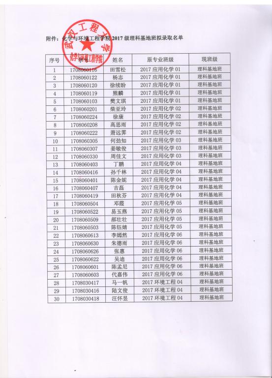 515足球直播 关于2017级应用化学专业理科基地班入选名单的公示