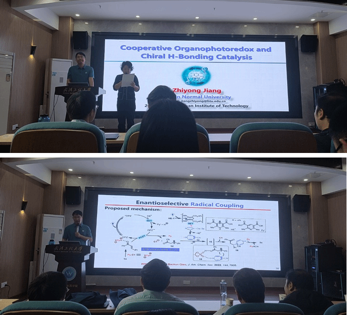 江智勇教授以《Cooperative Organophotoredox and Chiral H-Bonding Catalysis》为题,详细介绍了近年来课题组围绕自主研发的DPZ光敏剂协同催化以及调配分子内氢键实现的一系列不对称有机催化反应。对如何建立高活性基态与光氧化还原激发态有机催化平台,如何完成系列新颖的离子型与自由基型不对称反应进行了深入浅出的介绍。报告中,江教授分享了自己与学生开展研究的心路历程,鼓励在场青年教师与学生勇于创新、敢于突破,做有特色的科学研究。