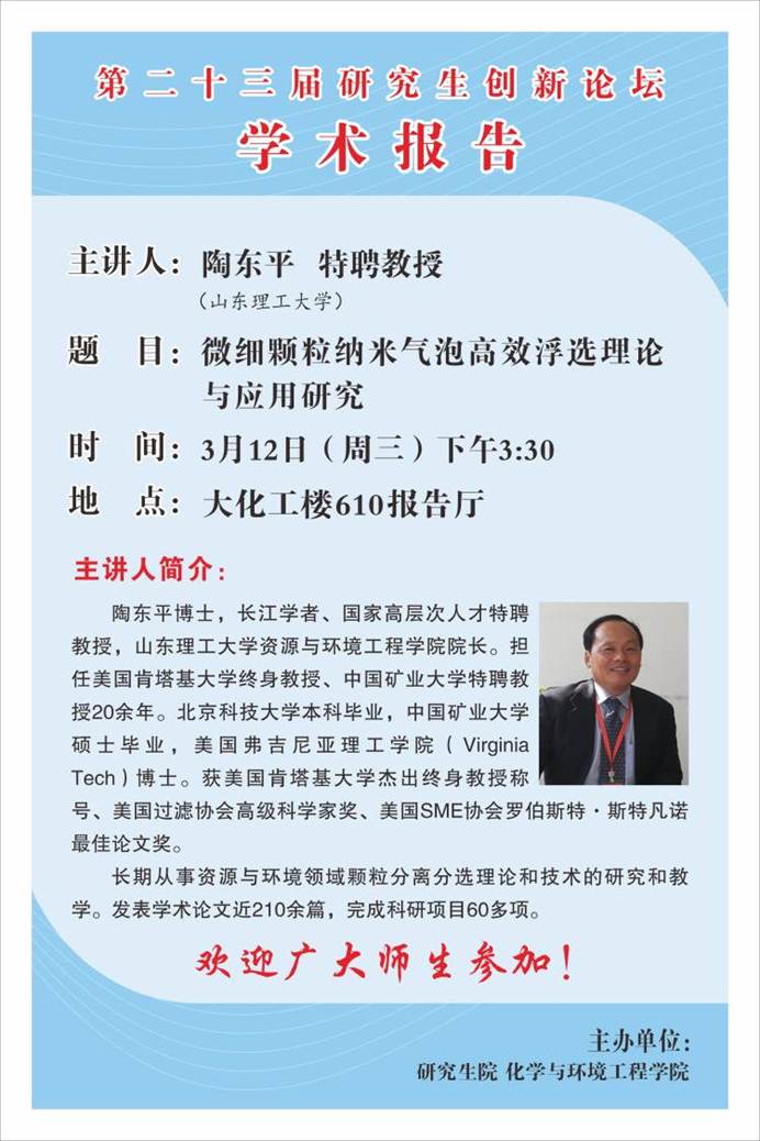 【研究生创新学术论坛】微细颗粒纳米气泡高效浮选理论与应用研究