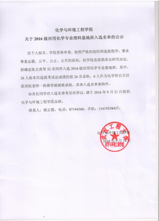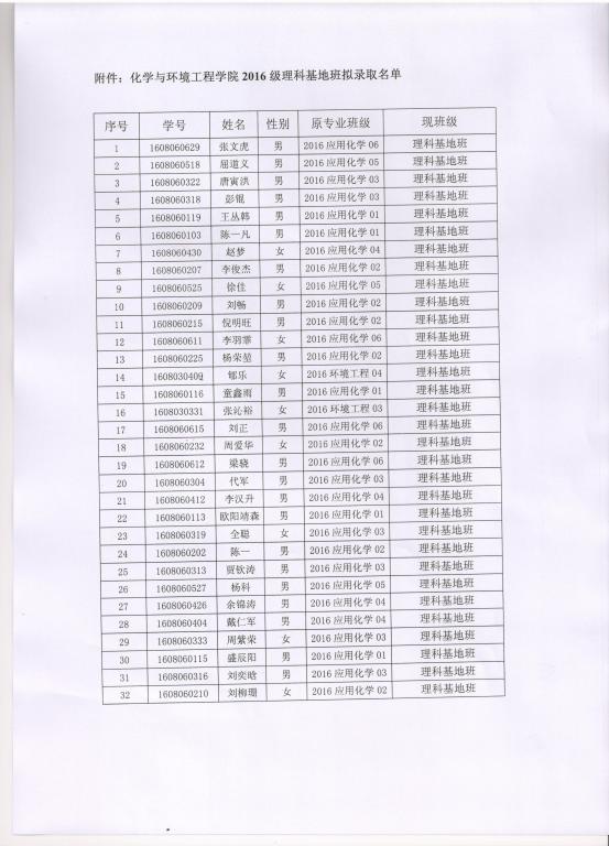 515足球直播 关于2016级应用化学专业理科基地班入选名单的公示